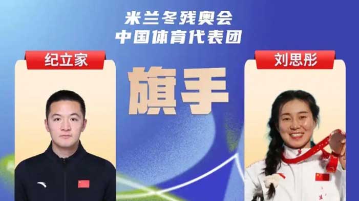 中国代表团第14位入场,现场大屏幕同时展示了位于科尔蒂纳、米兰与泰塞罗的中国代表团成员向观众致意的画面。高山滑雪运动员刘思彤与单板滑雪运动员纪立家共同担任旗手,两人携手擎旗入场,展现出中国残奥健儿的自信与昂扬。纪立家曾在2022年北京冬残奥会单板滑雪障碍追逐比赛中为中国代表团夺得金牌,刘思彤则在残奥高山滑雪项目中屡创佳绩。